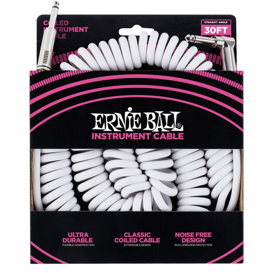 Ernie Ball 30' Coiled Straight / Angle Instrument Cable, White