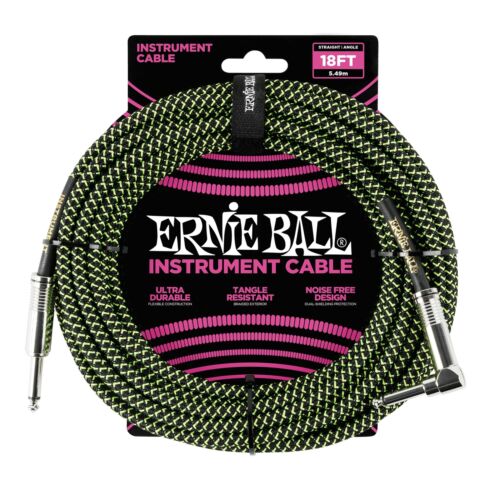 Ernie Ball 18' Braided Straight / Angle Instrument Cable, Black / Green