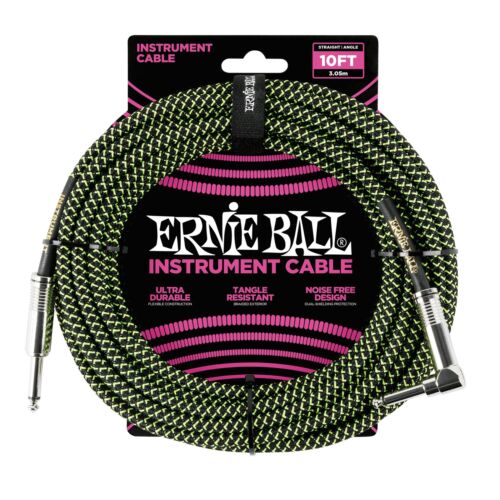 Ernie Ball 10' Braided 1/4" Straight / Angle Instrument Cable - Black/Green (10-foot)