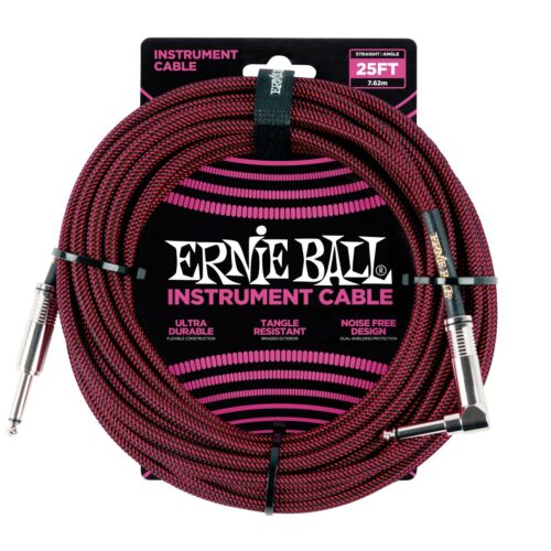 Ernie Ball 25' Braided Straight / Angle Instrument Cable, Black / Red