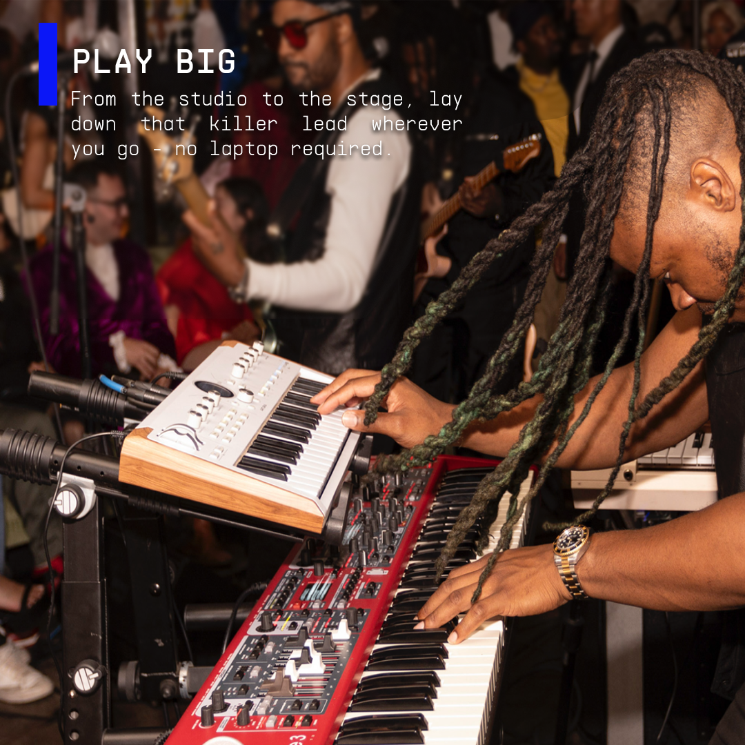 Purpose-built for live: rugged, responsive, and completely standalone. Power up, pick a sound, shape it in real-time and deliver pure musical expression wherever you play.