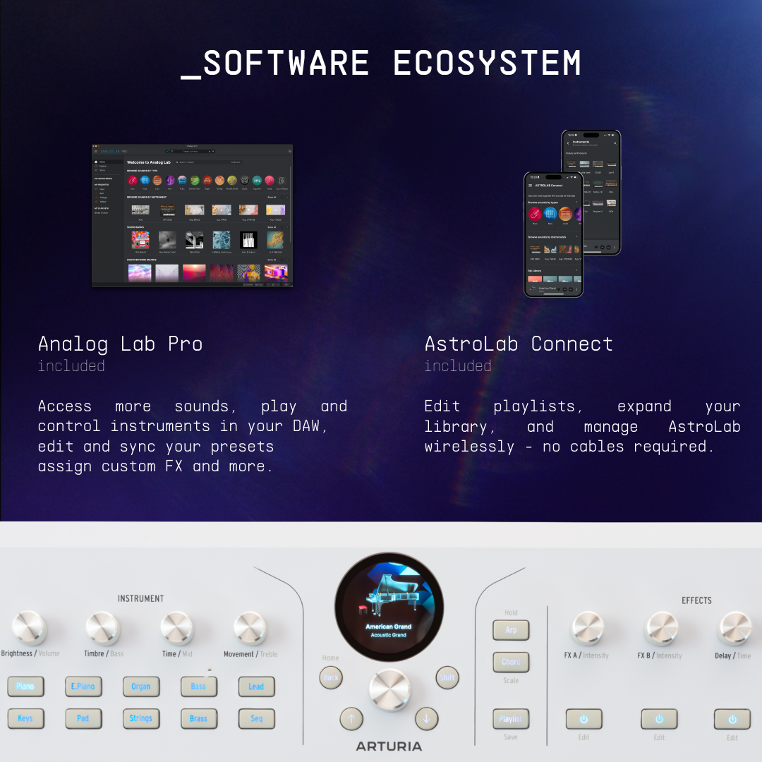 - Software ecosystem: Includes Analog Lab Pro and AstroLab Connect for mobile sound management.