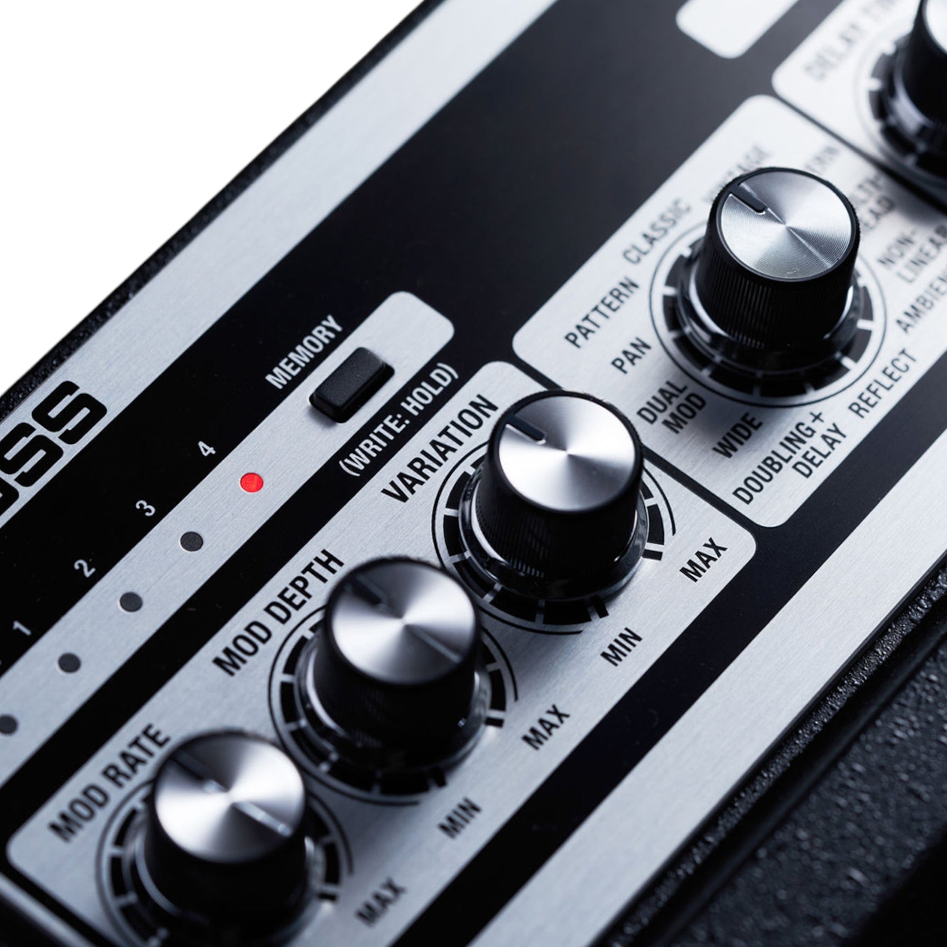Vintage—Retro analog delay sound inspired by the iconic BOSS DM-2 Delay pedal introduced in 1981. Adjust the modulation behavior by cycling through triangle, sine, and more complex waveform shapes with the Variation knob.
