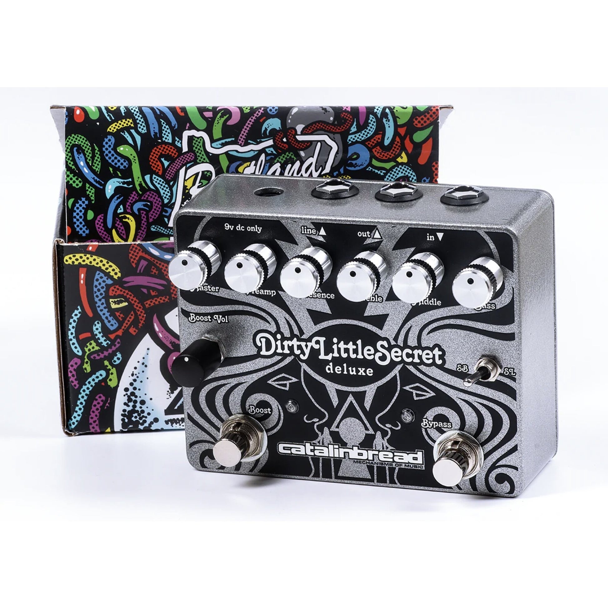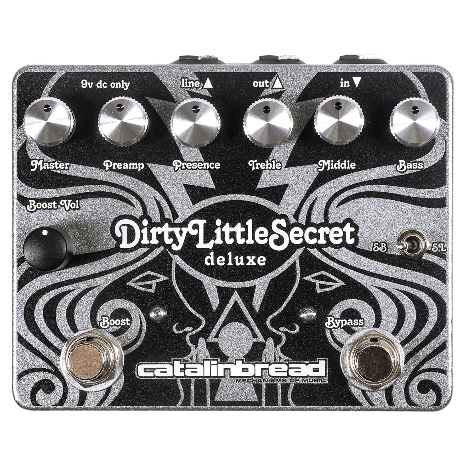 The Dirty Little Secret Deluxe represents the next logical step in Marshall Plexi emulation, reaching beyond the preamp circuit and adding the rest of the amp for an extremely authentic take on everything inside that chassis. Our original DLS circuit has been tweaked and upgraded throughout, now featuring a phase inverter, power amp sim and output transformer as well as some new features and the most requested modifications for the original. One such addition is a toggle switch on the outside to select between Super Lead and Super Bass modes, and we’ve also externalized the Presence knob to easily dial in your preferred Marshall flavor. Also added is a piece of the Dirty Little Secret—a single preamp tube simulator—as a built-in boost circuit that can be used independently of the main circuit. You can run the boost and DLS in any order you like; put the boost before the DLS for a high-powered saturated tone or after to pummel the front end of your amp. A new tightness knob lets you shave off the sub-bass for a little extra clarity or completely attenuate the low end for some cool thrash metal tones. A Line Out jack gives you a dedicated +10dB output that you can use with a mixer or DAW, and you can use both outputs simultaneously. Between the Boost, order selector and the external Super Lead/Super Bass modes, the Dirty Little Secret Deluxe is engineered to be a total performance tool that does the line justice.
