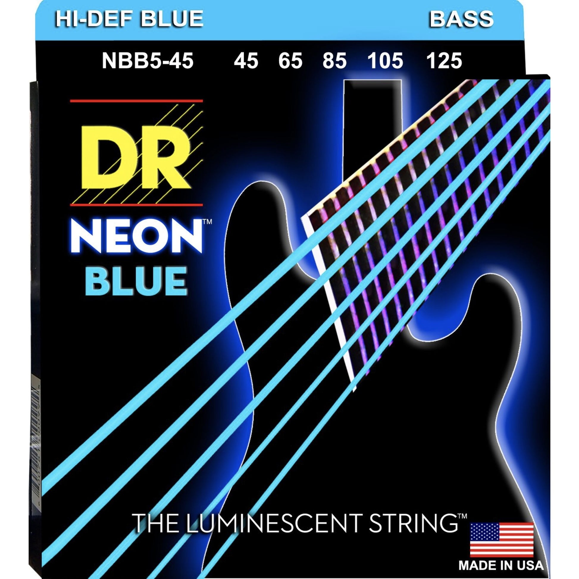 DR Strings NBB5-45 Neon Hi-Def Blue Bass Strings, 45-125 Medium 5-String Set