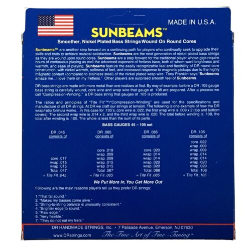 Sunbeams are another step forward on a continuing path for players who constantly seek to upgrade their skills and tools to achieve musical satisfaction. Sunbeams are the next generation of nickel-plated bass strings as they are wound on round cores. Sunbeams are a step forward for the traditional player and the advanced exponent of fretless bass player, both of whom want brightness and warmth. Sunbeams feature the easily recognizable feel and flexibility of DR round core construction, with nickel warmth, softness of feel and increased response to magnetic pickups due to the sensitive magnetic content (compared to stainless steel) of the nickel plated wrap wire. Tony Franklin says "Sunbeams amaze me....I love them on my fretless. A long time favorite of Adam Clayton as well.
