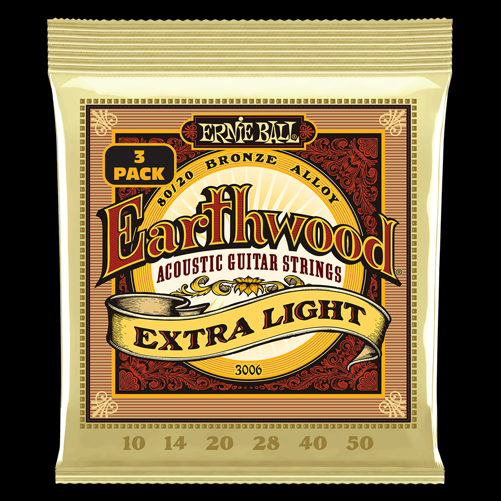 Now available in convenient three-set packs. Ernie Ball Earthwood Extra Light 80/20 Bronze Acoustic Guitar Strings are made from 80% copper, 20% zinc wire wrapped around hex shaped brass plated steel core wire. These acoustic guitar strings provide a crisp, ringing sound with pleasing overtones. Gauges .010, .014 .020, .028, .040, .050