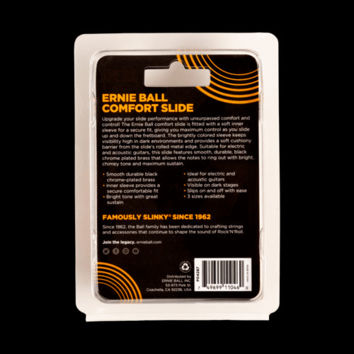 Upgrade your slide performance with unsurpassed comfort and control. The Ernie Ball comfort slide is fitted with a soft inner sleeve for a secure fit, giving you maximum control as you slide up and down the fretboard. The brightly colored sleeve keeps visibility high in dark environments and provides a soft cushiony barrier from the slides’ rolled metal edge. Suitable for electric and acoustic guitars, this slide features smooth, durable, black chrome plated brass that allows the notes to ring out with a bright, chimey tone and maximum sustain.
