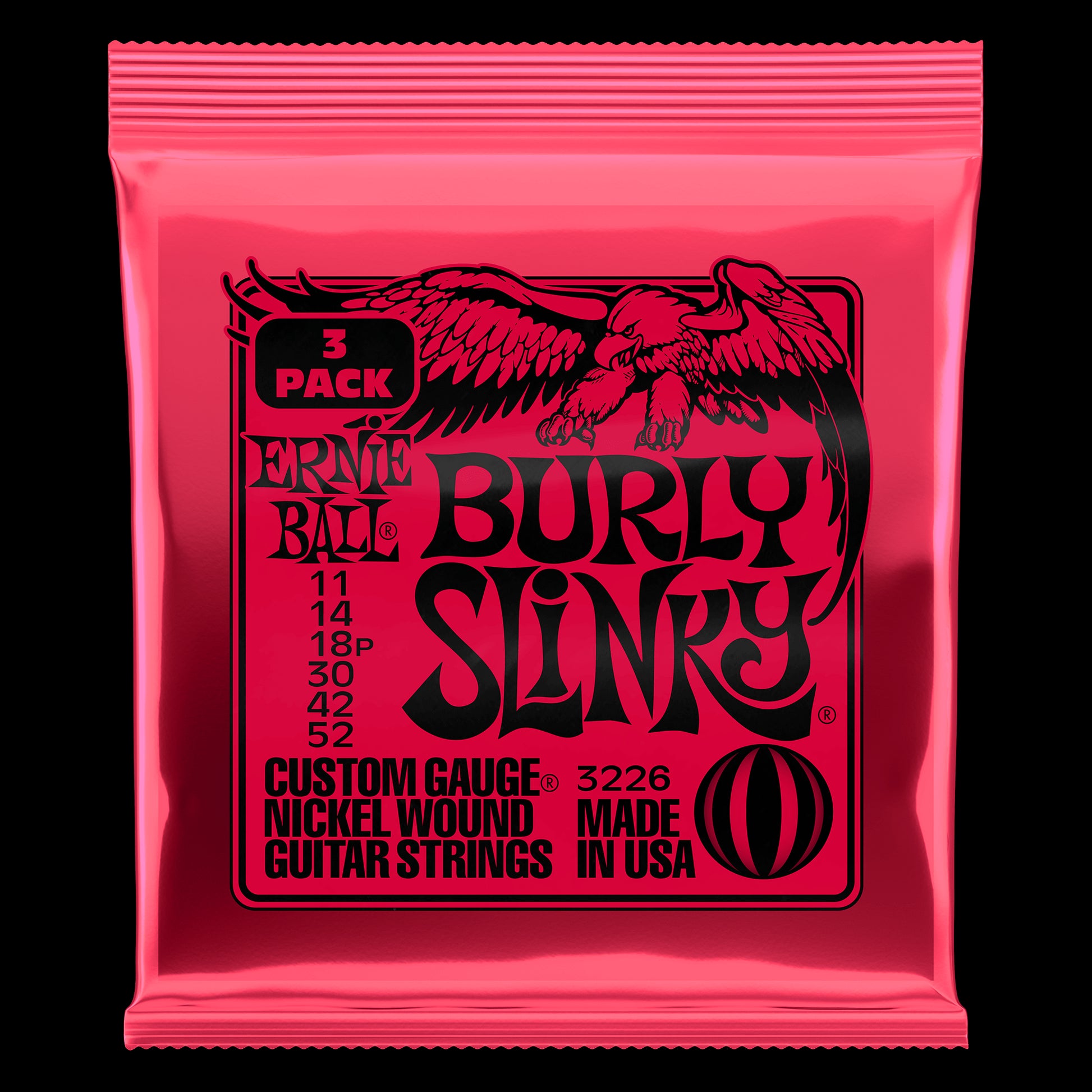 Now available in convenient three-set packs. Ernie Ball Burly Slinky Nickel Wound Electric Guitar Strings are made from nickel plated steel wire wrapped around tin plated hex shaped steel core wire. The plain strings are made of specially tempered tin plated high carbon steel producing a well balanced tone for your guitar. Gauges .011, .014, .018p, .030, .042, .052