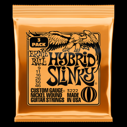 Now available in convenient three-set packs Ernie Ball Hybrid Slinky Electric Strings are a perfect match for those who like the ability to combine the combination of Super and Regular Slinkys. These strings are precision manufactured to the highest standards and most exacting specifications to ensure consistency, optimum performance, and long life. Hybrid Slinky wound strings are made from nickel plated steel wire wrapped around a hex shaped steel core wire. The plain strings are made of specially tempered tin plated high carbon steel producing a well balanced tone for your guitar. Gauges .009, .011, .016, .026, .036, .046