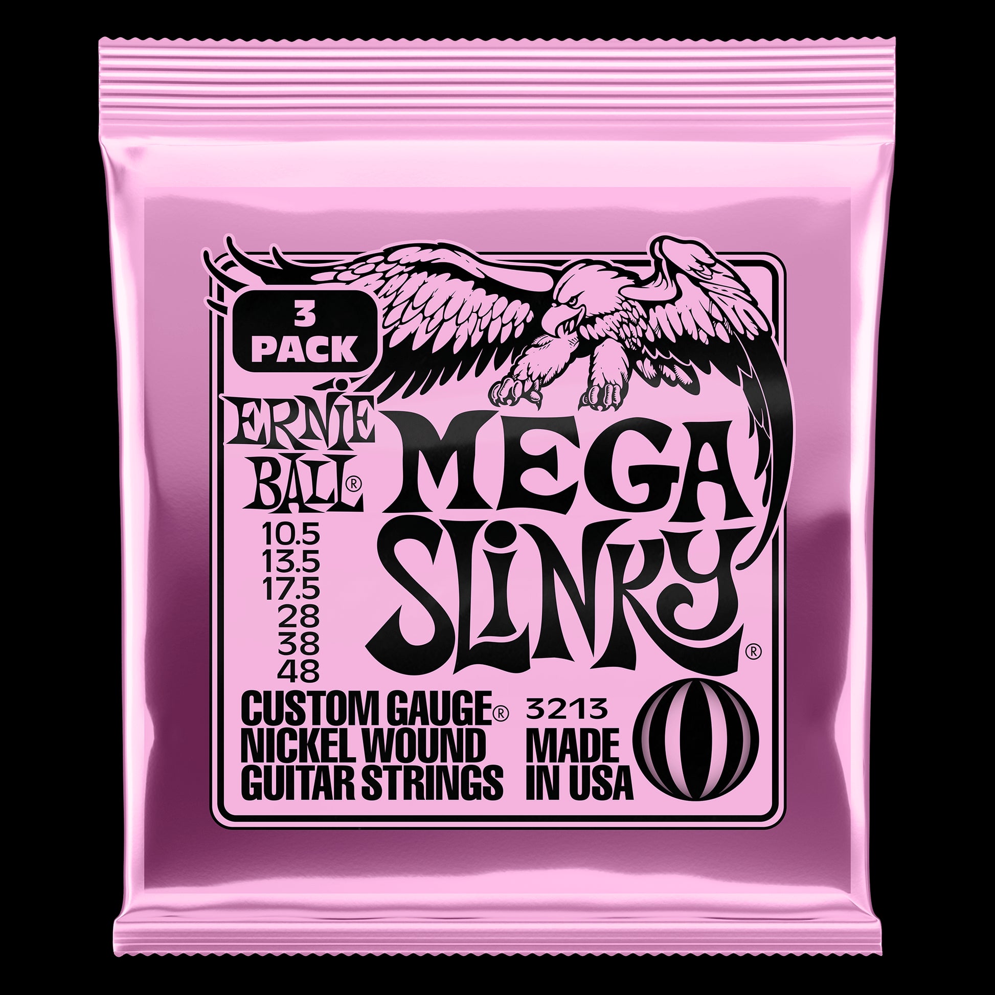 Now available in convenient three-set packs. Ernie Ball Mega Slinky Nickel Wound Electric Guitar Strings are made from nickel plated steel wire wrapped around tin plated hex shaped steel core wire. The plain strings are made of specially tempered tin plated high carbon steel producing a well balanced tone for your guitar. Gauges .0105, .0135, .0175, .028, .038, .048