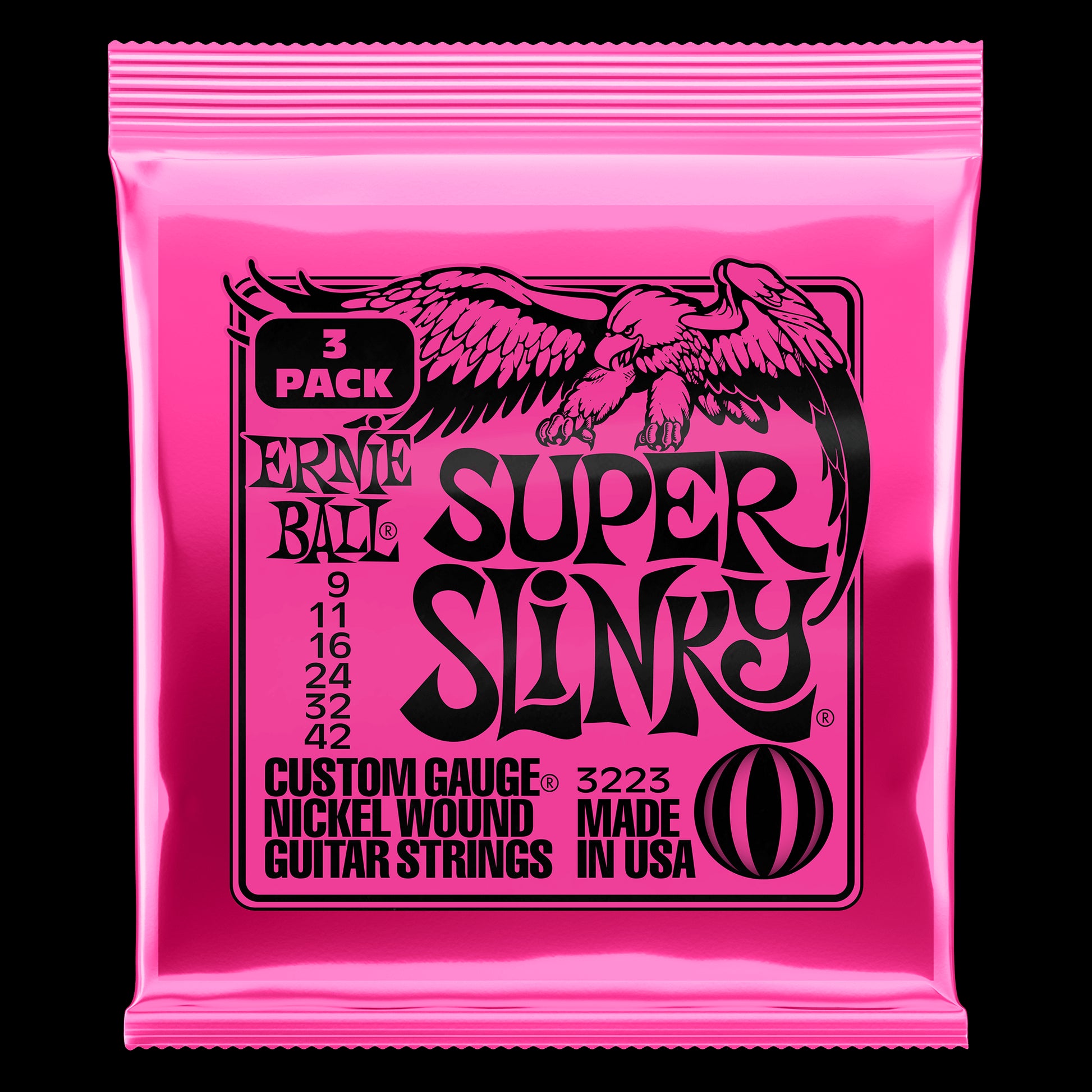 Now available in convenient three-set packs. Ernie Ball Super Slinky Electric Strings are played by Jimmy Page, Iron Maiden, and Angus Young. These strings are precision manufactured to the highest standards and most exacting specifications to ensure consistency, optimum performance, and long life. Super Slinky wound strings are made from nickel plated steel wire wrapped around a hex shaped steel core wire. The plain strings are made of specially tempered tin plated high carbon steel producing a well balanced tone for your guitar. Gauges .009, .011, .016, .024w, .032, .042