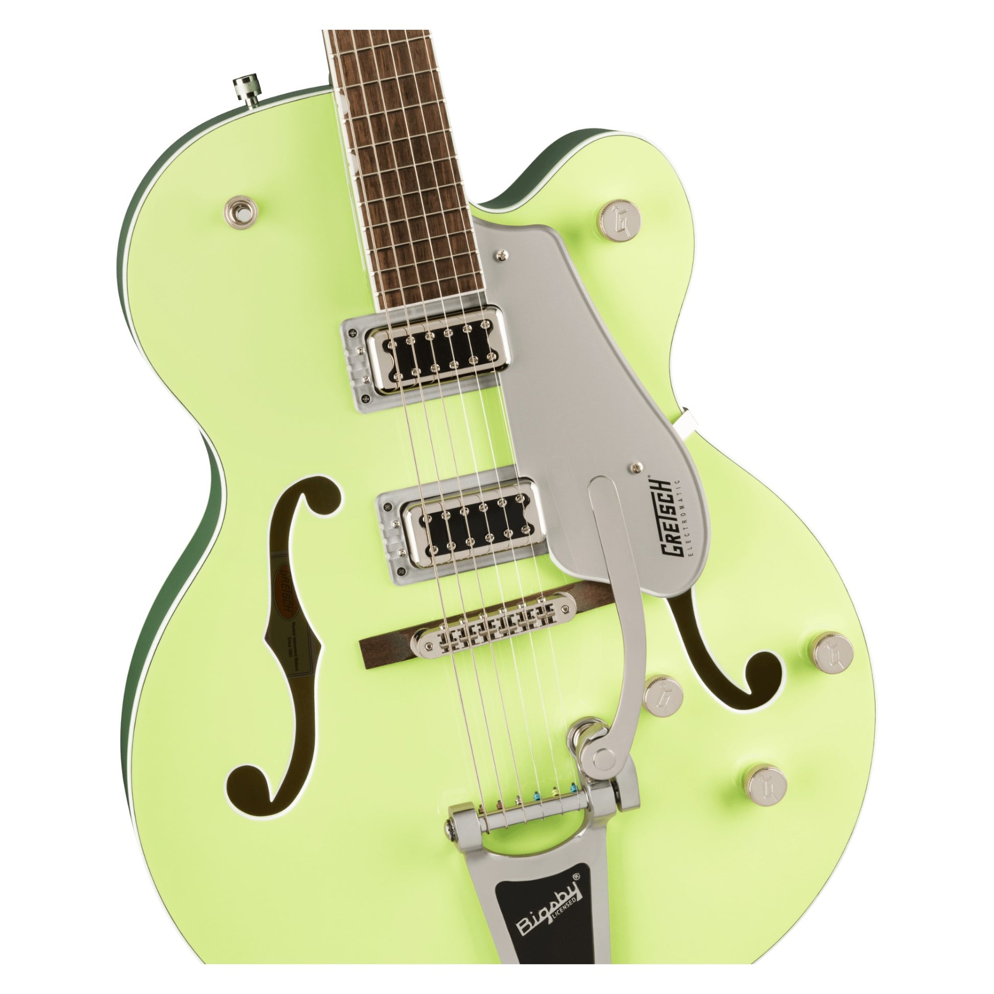 Alive and resonant, the G5420T also features a versatile upgraded control layout including master volume with treble bleed circuit, master tone, individual pickup volume controls and three-position pickup toggle switch, oversized bound F-holes, multi-ply body binding, smaller late-'50s G6120 bound headstock, vintage-style open-back tuning machines, Graph Tech® NuBone® nut, pearloid Neo-Classic™ thumbnail inlays, secured Adjusto-Matic™ bridge and a Bigsby® B60 vibrato tailpiece.