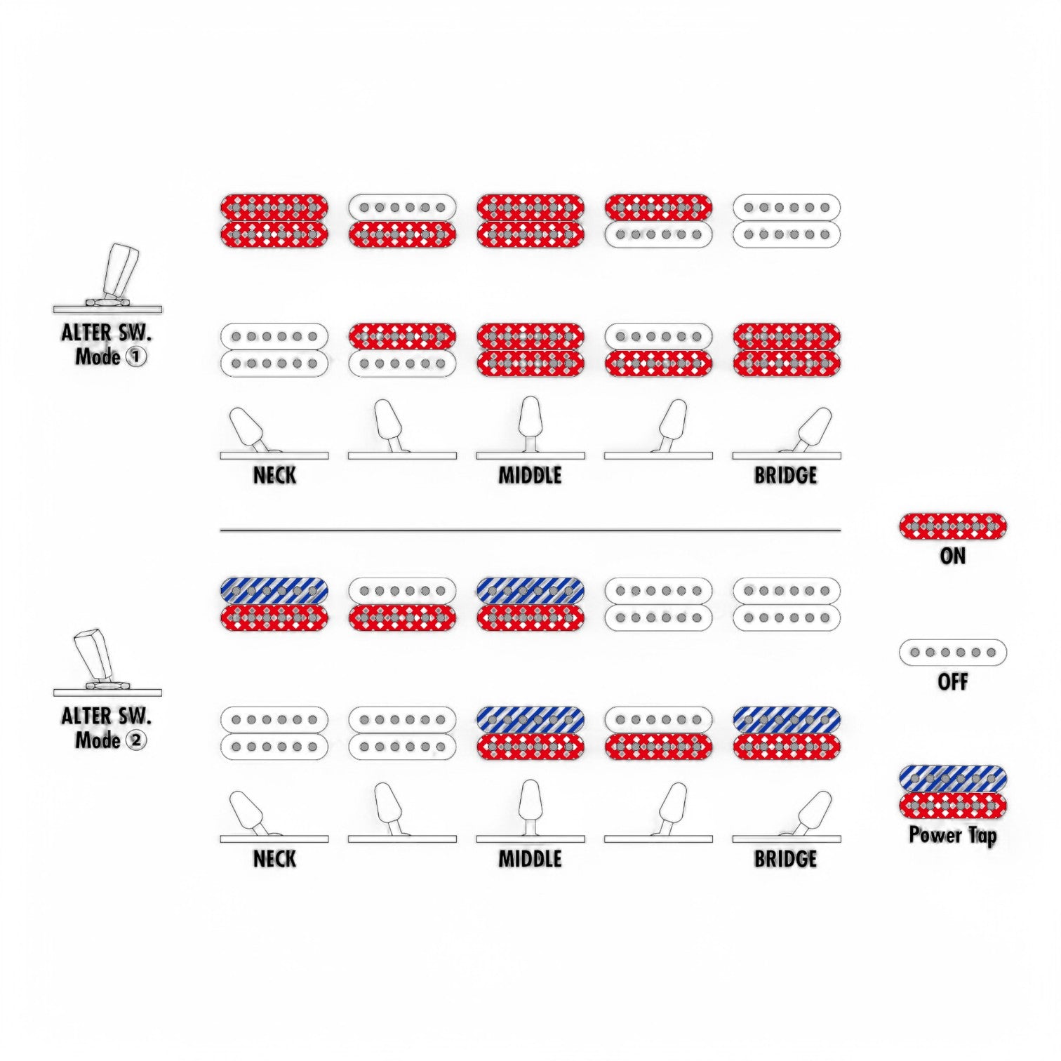 dyna-MIX10 switching system with Alter Switch - The dyna-MIX 10 offers ten sound variations and can easily switch from humbucker and single coil modes with the mini switch. The power Tap mode provides a realistic single coil sound despite its two humbucker pickup layout.