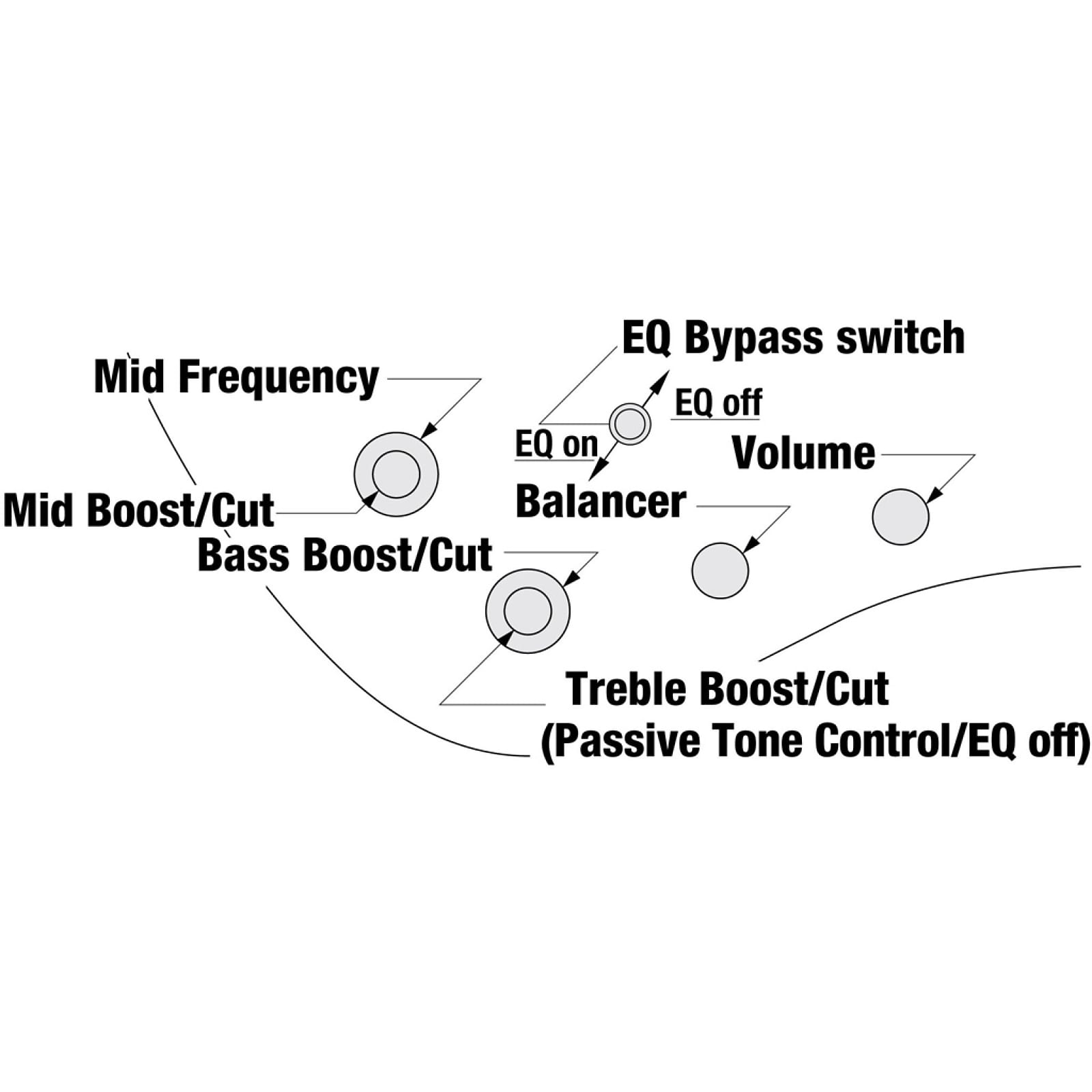 The EQ bypass control offers precision tonal adjustments, including a switch to choose passive-only operation. When the EQ bypass is activated, the treble tone control knob becomes the global tone control for the passive circuit.