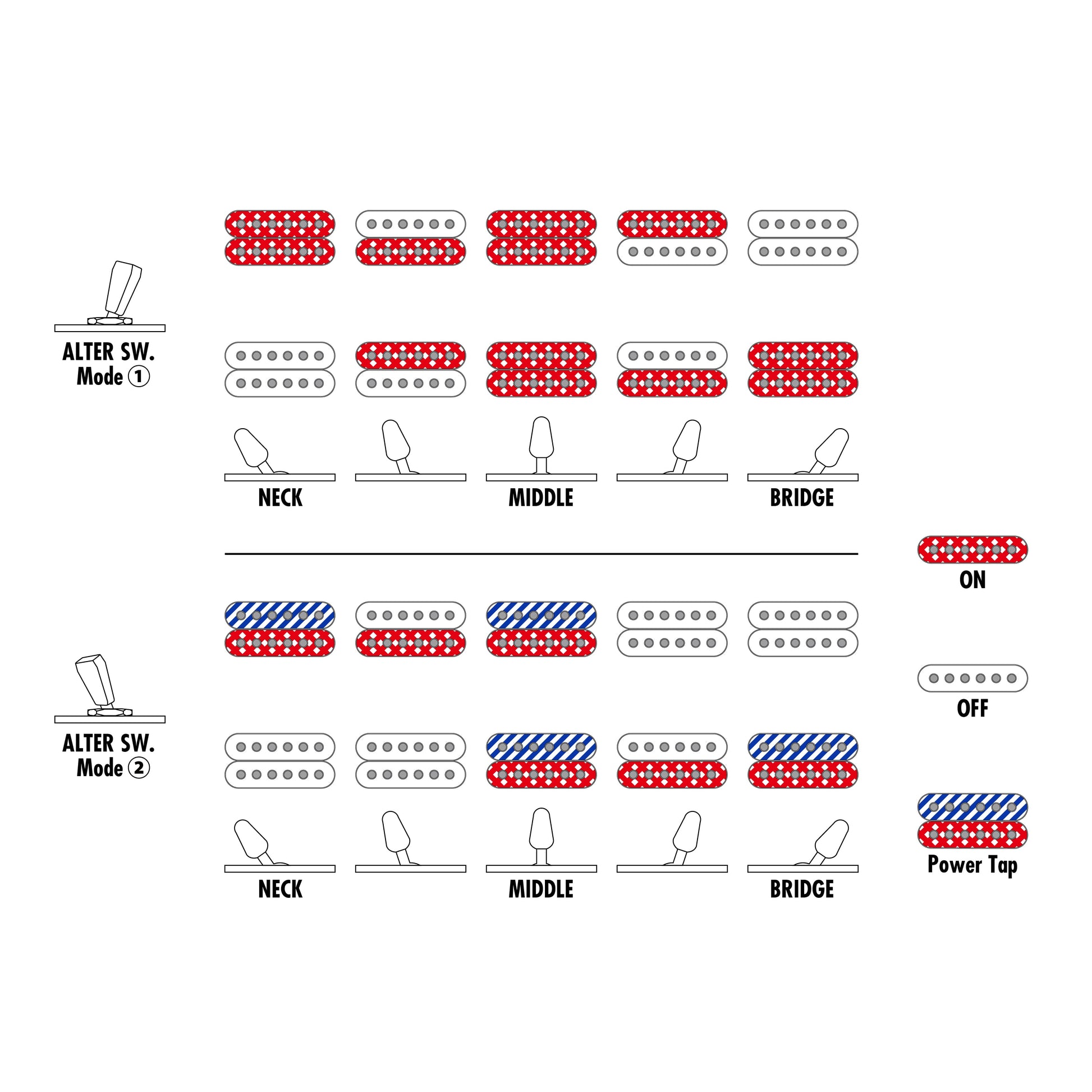 - dyna-MIX10 switching system with Alter Switch - The dyna-MIX 10 offers ten sound variations and can easily switch from humbucker and single coil modes with the mini switch. The power Tap mode provides a realistic single coil sound despite its two humbucker pickup layout.