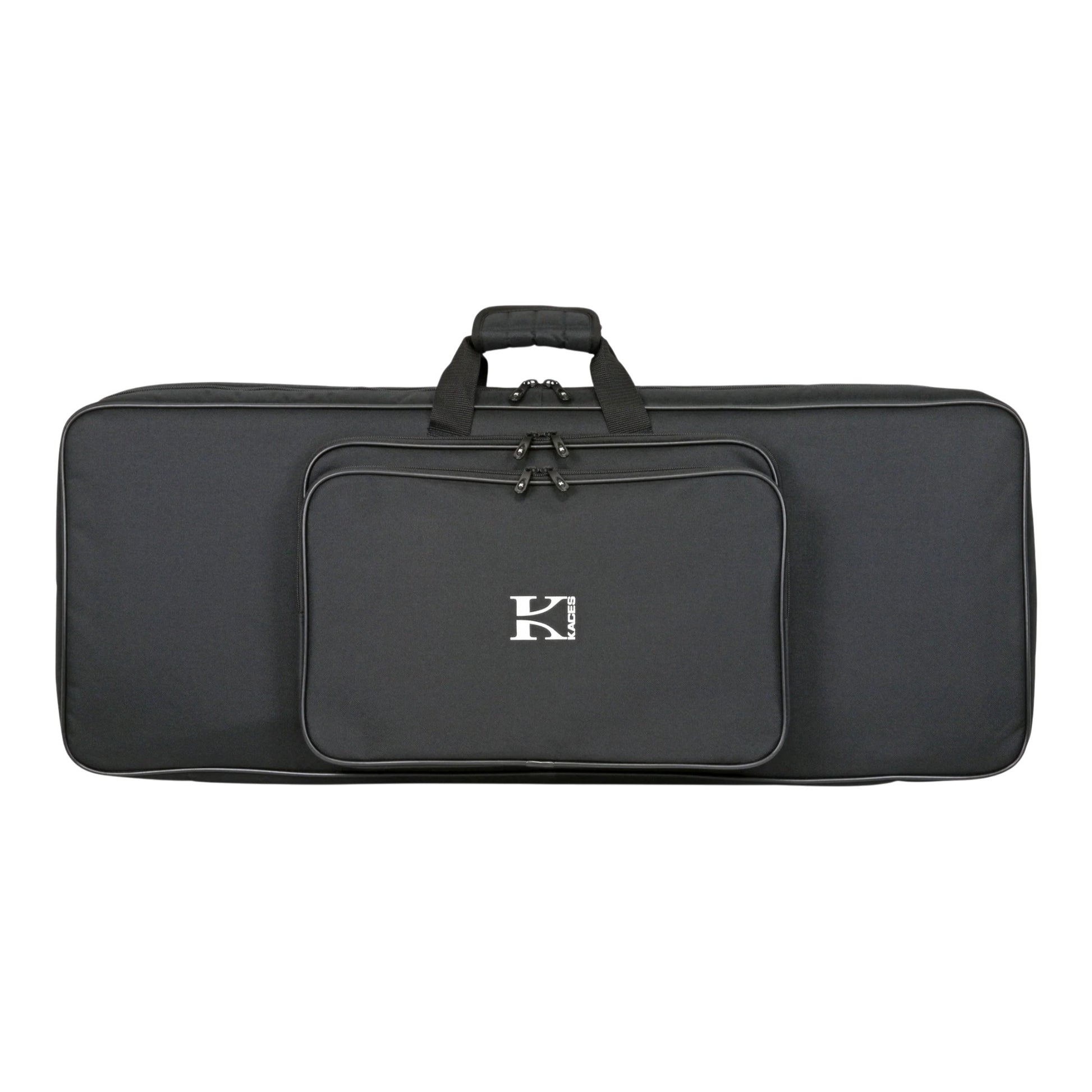 The Kaces Xpress Series keyboard bag features a water-resistant, luggage-grade, 600D polyester exterior, quilted grip handle, and dense, protective foam padding. There are two large, expandable pockets with room for a laptop or table top synth, cables, power supplies, sustain pedals, sheet music, microphones, and other accessories. Each bag has extra-strength stitching at tested stress points, silver, easy-pull zippers, and metal hardware. 35" x 13" x 4" (80 cm x 33 cm x 10 cm) fits most 49 note keyboards. 1 year limited warranty.