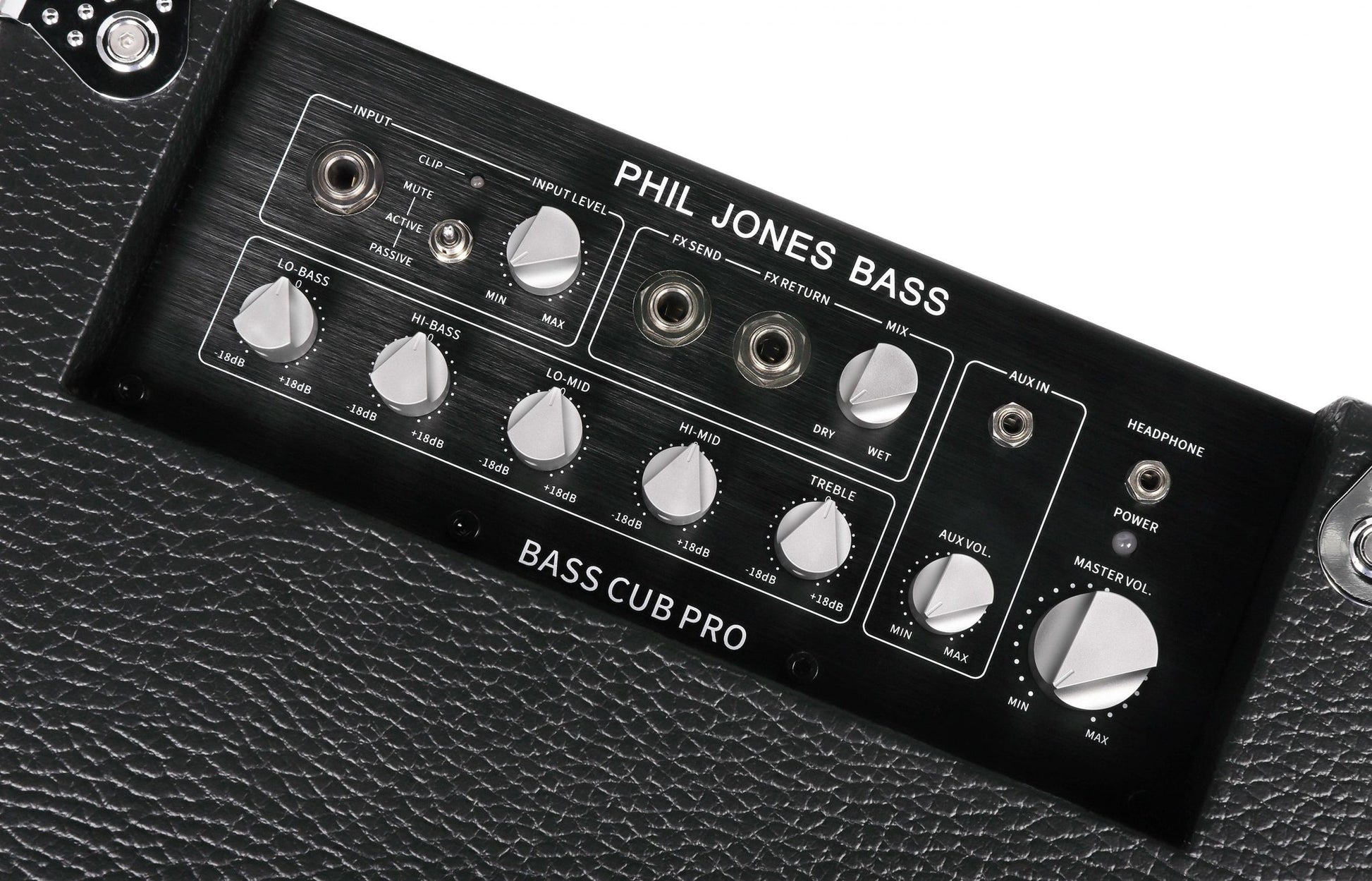 The cabinet is constructed of solidly braced Baltic birch plywood and is appointed with luxury “tolex” covering with color options of both Burgundy Red and Black. The input has a switchable gain (for active and passive basses), mute switch, and LED clip indicator which will accurately match all bass instruments. The FX Send/Return sockets feature a blend control to achieve desired balance between FX and dry signals. An auxiliary input has a level control for quick mixing of external devises such as a drum machine or iPod/MP3 player, which are audible through the stereo Headphone Socket or speakers.