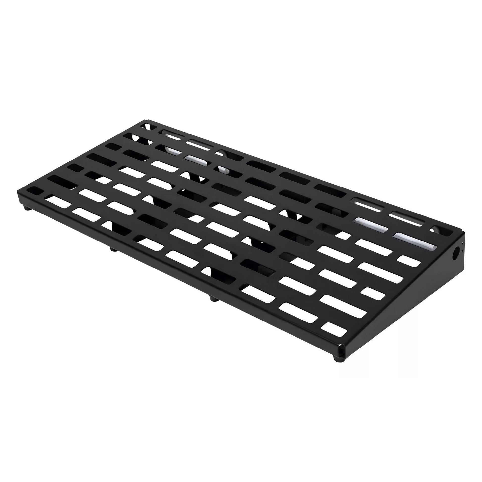 The RockBoard RBO B 4.4 QUAD B pedalboard offers space for approx. 9 to 18 pedals (depending on the size of the pedals) and comes with a perfectly matched gig bag. The robust, water-repellent RokTex surface, the reinforced PVC (polyvinyl chloride) bottom, and the 10 mm padding offer perfect protection while providing easy transportation. The RockBoard pedalboard series has been designed to create a pedalboard that is lightweight, warp resistant, and robust, and above all, allows the use of a wide range of pedals, as well as power supplies and their mounting solutions. Its unique and ingenious design is based on only a single cold-rolled sheet of aluminum without a single weld. As a result, it offers a flat surface that can be fully utilized. U-shaped vertical braces give the board extra stability without making it noticeably heavier, making the board completely torsion-resistant and preventing bending even under maximum load. The innovative slot design works with common mounting solutions or, perfectly, with our RockBoard QuickMount system. In addition, the slots make it easy to route cables under the board surface for a clean setup. Almost all common power supplies can be mounted either under the board surface directly or by using our optionally available RockBoard The Tray or BasePlates. All RockBoard models (except the DUO series) are compatible with our RockBoard All-In-One PatchBays, which are a useful addition to any RockBoard.