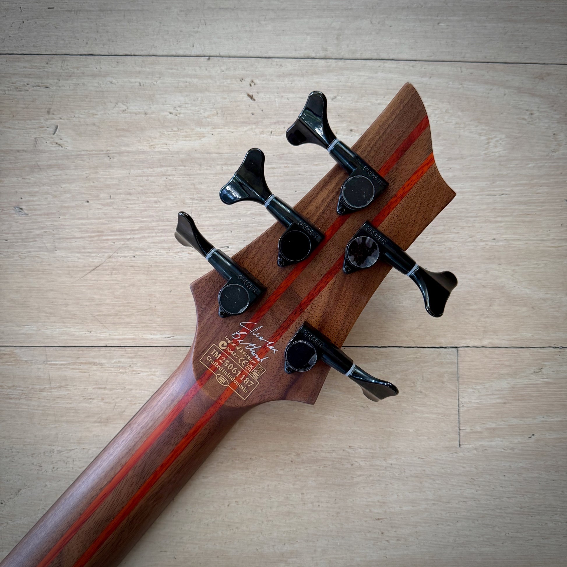 - Walnut neck with padauk stringers and 2 carbon fiber reinforcement rods for stability