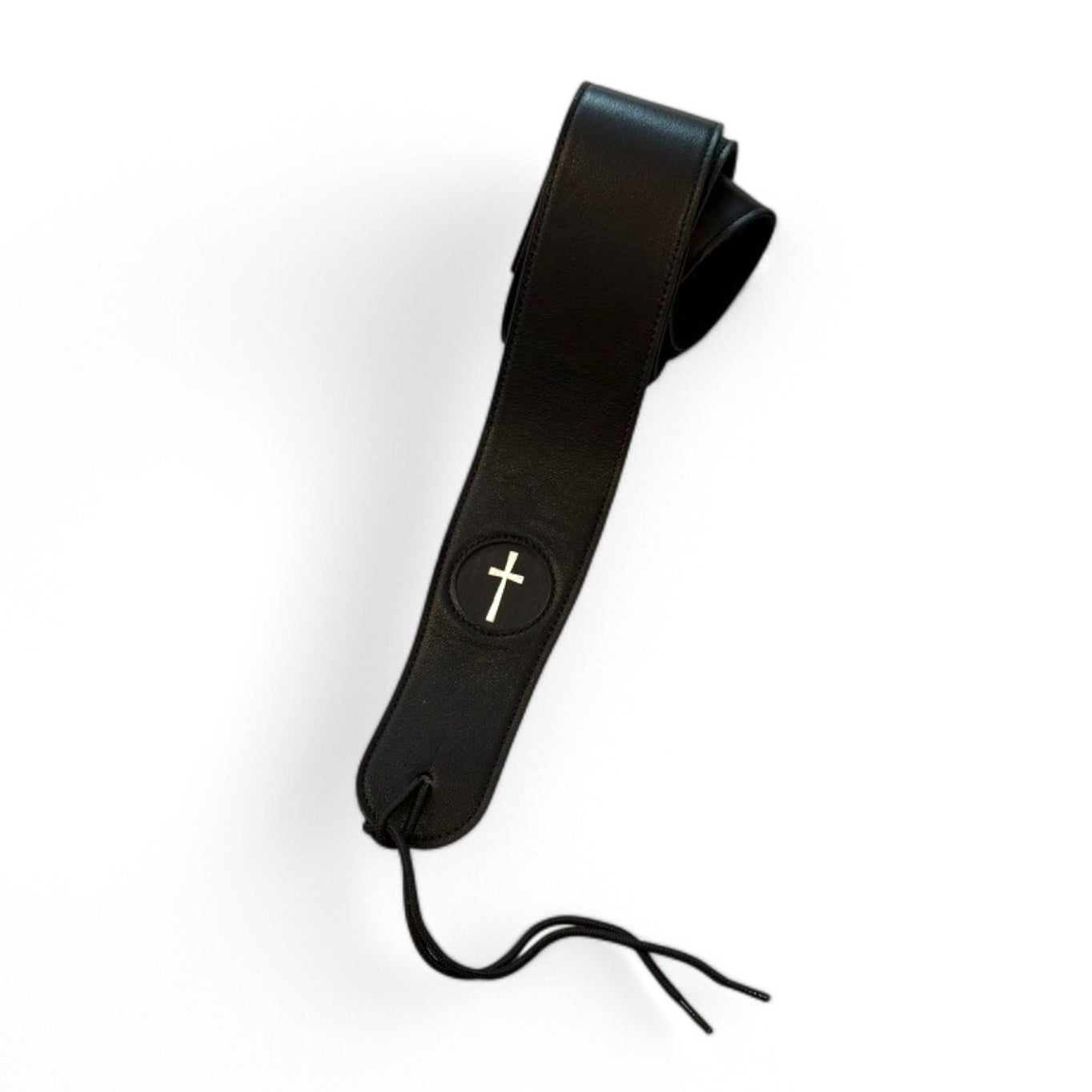 Thalia Premium Italian Black Leather Guitar/Bass Strap, Black Ebony Inked Wood Medallion with Mother of Pearl Cross Inlay