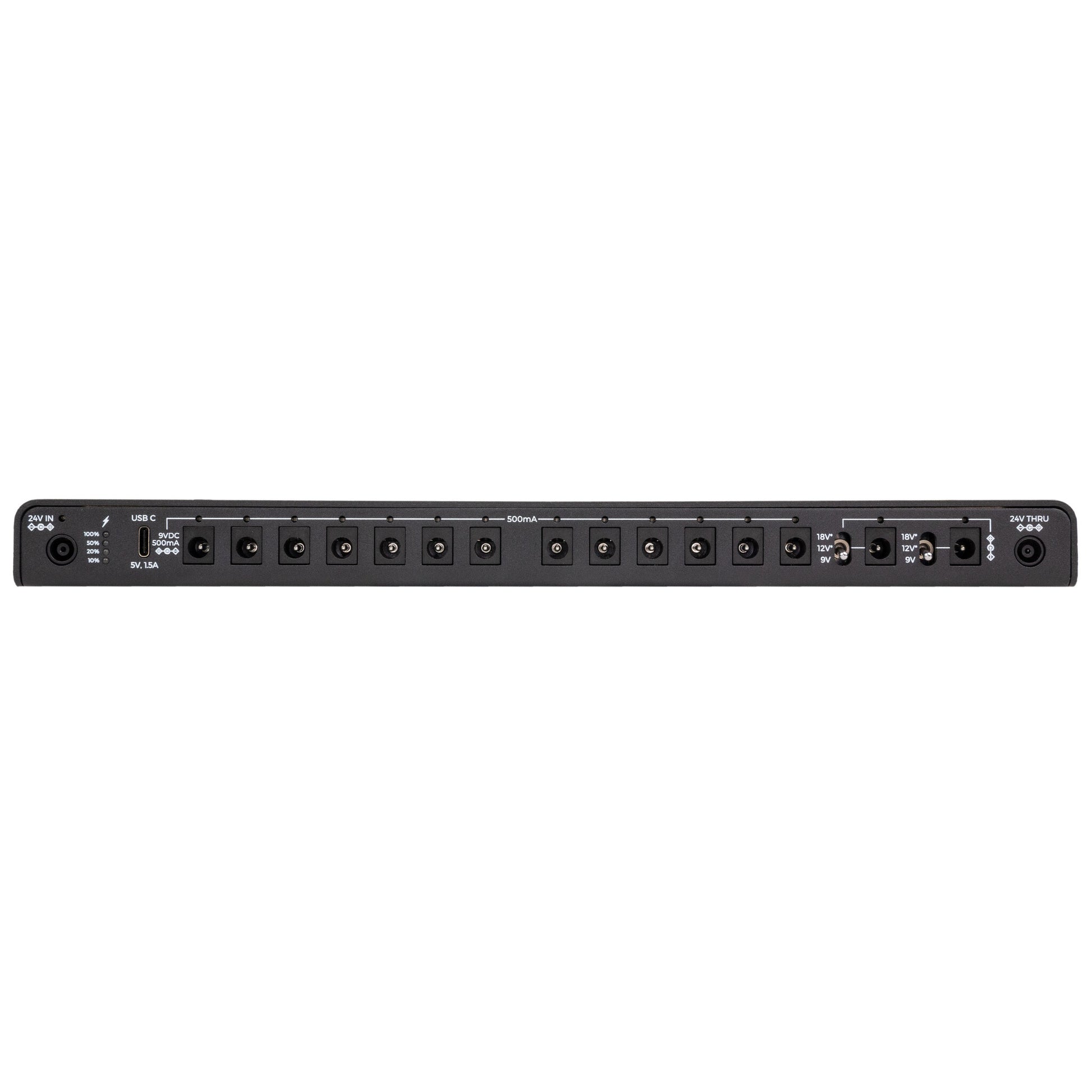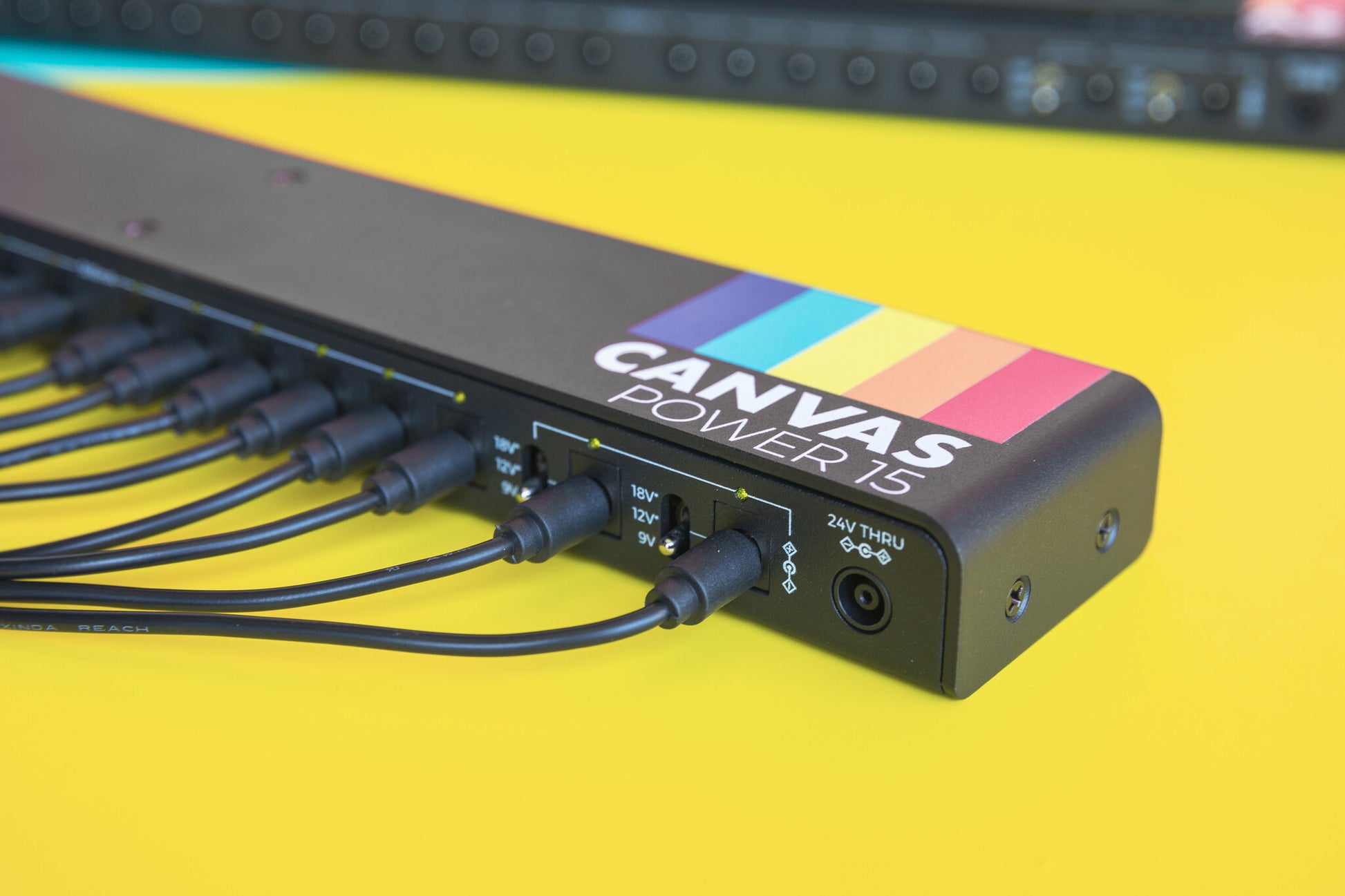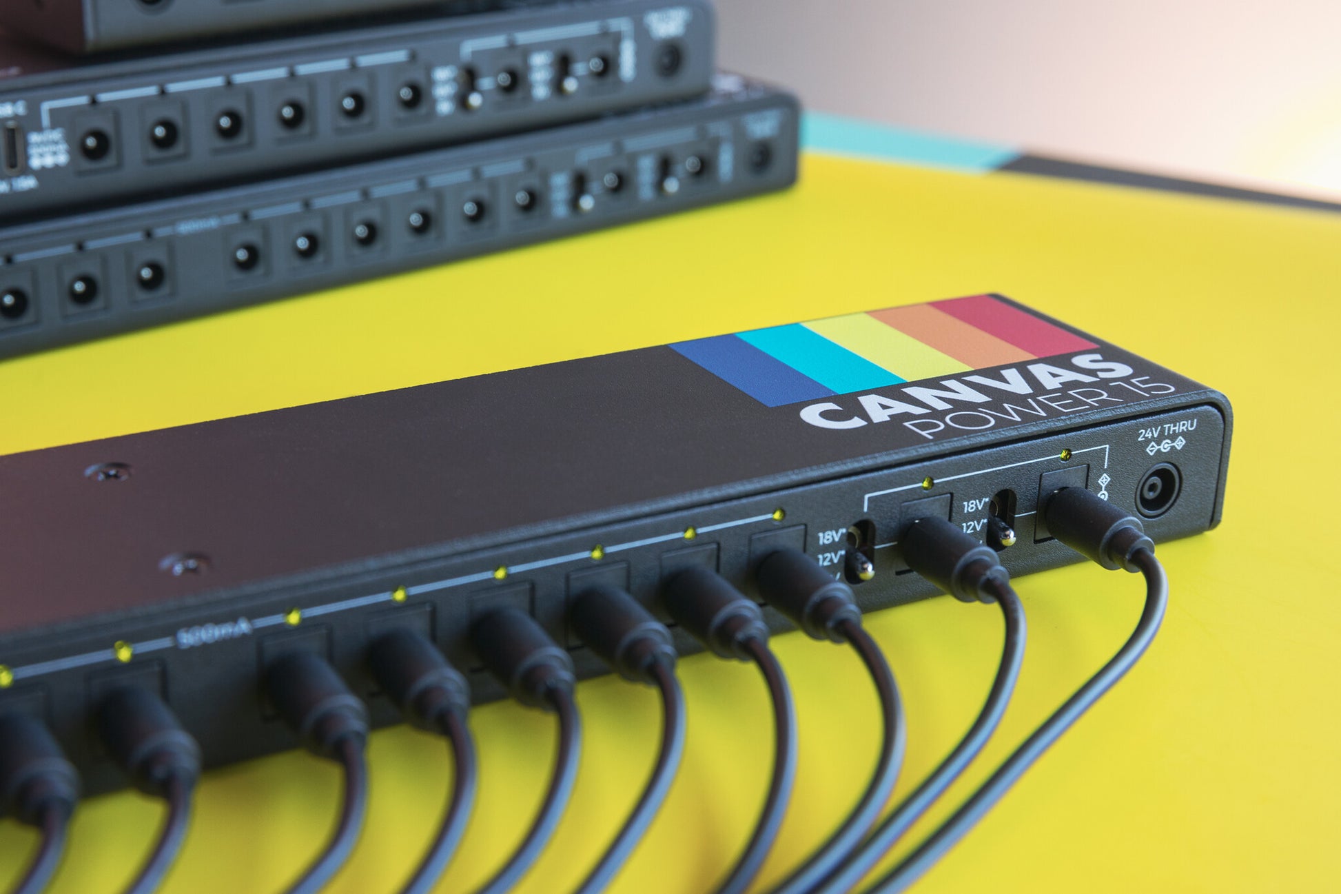 The Canvas Power 15 has 15 isolated power outputs delivering up to 500mA of clean power at 9v. Two of the outlets are variable voltage, letting you switch between 9v, 12v, and 18v for powering high-voltage pedals. It also includes a USB-C port for powering devices like your phone or tablet while you play.