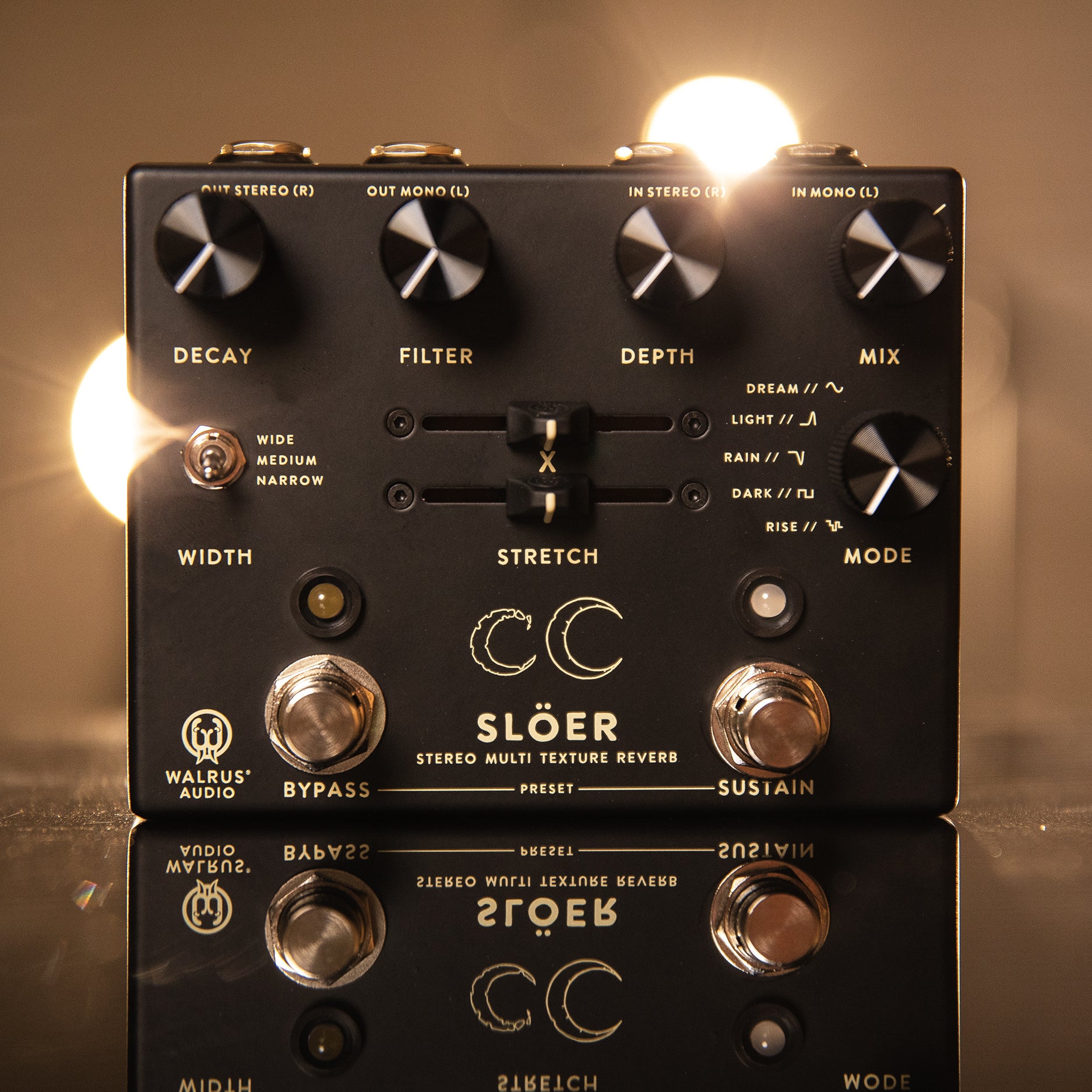 the Slö: Dark (Lower Octave), Rise (Ambient Swell), and Dream (Latching Pad); and the addition of two new modes: Rain (Delay Tap Diffusion) and Light (High Octave Shimmer). Secondary functions on the dial change between five different wave shapes for modulation on the reverb trail.